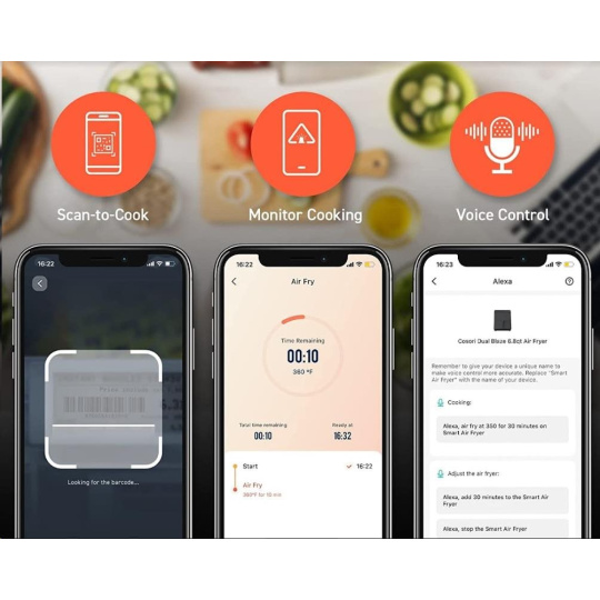 Vďaka SMART ovládaniu môžete jedlá pripravovať pomocou svojho smartphonu. Jednoducho stiahnite bezplatnú aplikáciu z Google Play alebo App Store. V aplikácii môžete voliť jednotlivé programy, prehliadať recepty, sledovať pokrok prípravy jedla alebo nastaviť upozornenia. Fritéza je tiež kompatibilná s Amazon Alexa a Google Asistant.