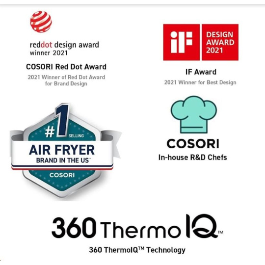 Dizajn horkovzdušnej fritovacej hlavy COSORI CAF-P583S bol navrhnutý v Kalifornii. Vďaka svojej praktickosti, funkciám, ovládaniu aj prehľadnému naklonenému dotykovému LED displeju s ľahko dostupnými tlačidlami získal tiež prestížne ocenenie Red Dot Award za najlepší dizajn.