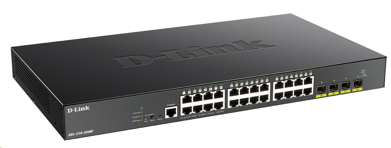 BAZAR - D-Link DGS-1250-28XMP 28-port Gigabit Smart PoE Switch, 24x GbE PoE+, 4x SFP+, PoE 370W - Poškozený obal (Komple