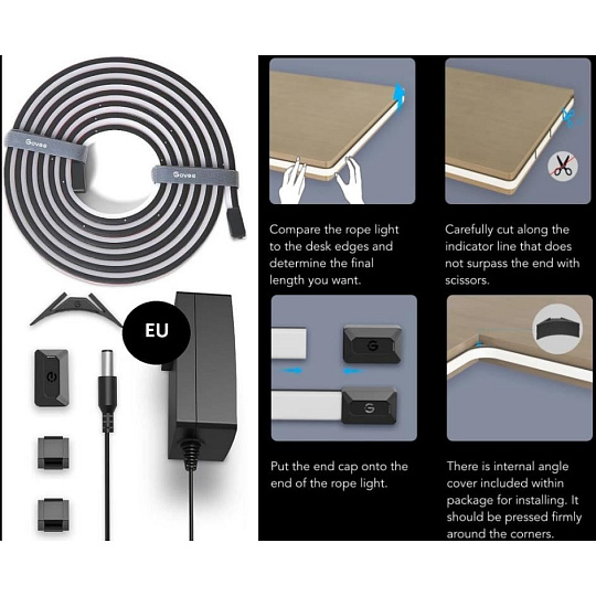 Inštalácia je veľmi jednoduchá pomocou 3M pásky. Govee Neon je pružný a ohybný pás, ktorý môžete tvarovať podľa tvaru svojho stola. V balení sú tiež spony na inštaláciu na stôl v tvare L alebo s pravými uhlami. Celková dĺžka je 3 metre a na páske sú značky, kde možno pások skrátiť jednoduchým prestrihnutím. Neorezávajte pás mimo označené body určené na to, poškodia sa kontakty a páska.