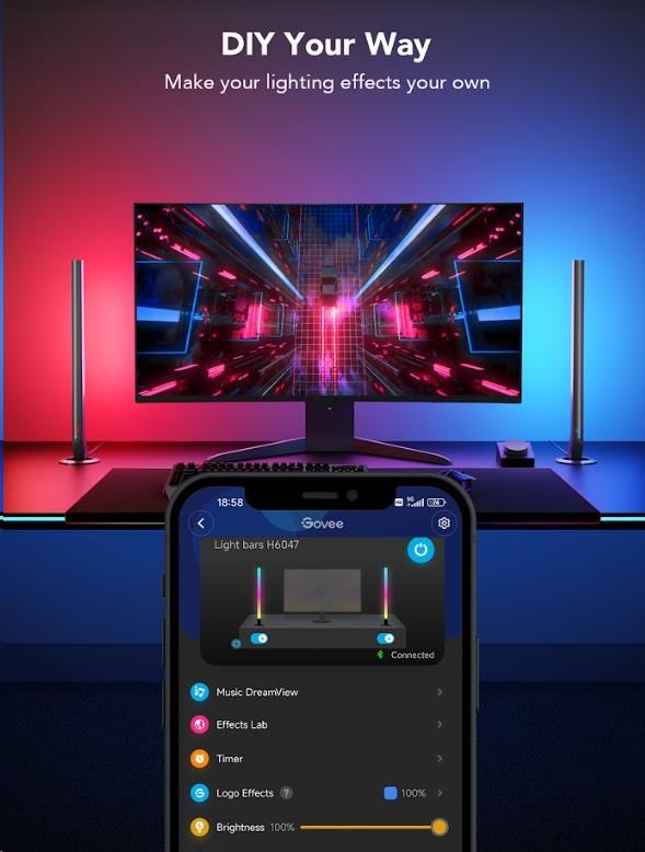 Spravujte nastavení barev a intenzity světla jednoduše pomocí aplikace Govee Home. Aplikace je zdarma ke stažení v Google Play a AppStore. Navíc získáte přístup k funkci časovače, DIY barvám, režimu videa, synchronizaci hudby a režimům scény. Světlo je možné ovládat i přímo na dodávaném ovládači Smart Dual.