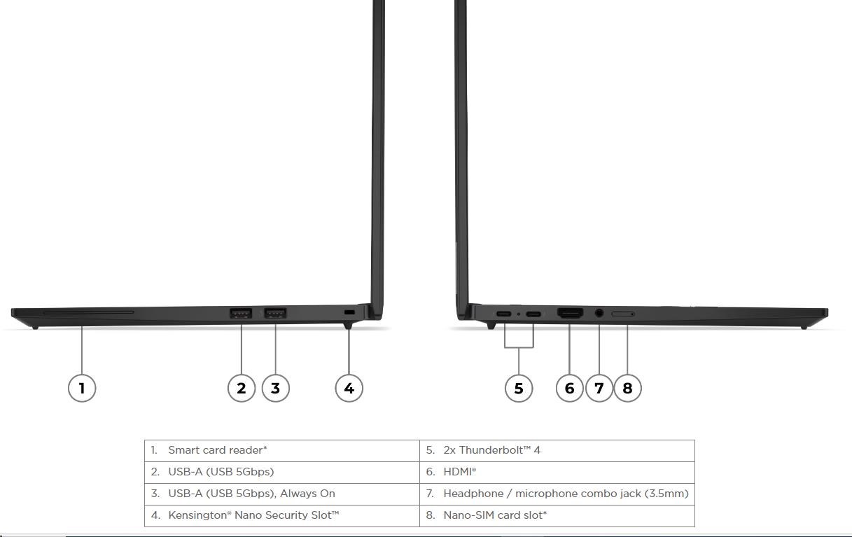 | Standartné porty | 1x USB-A (USB 5Gbps / USB 3.2 Gen 1) 1x USB-A (USB 5Gbps / USB 3.2 Gen 1), Always On 2x USB-C® (Thunderbolt™ 4 / USB4® 40Gbps), with USB PD 3.0 and DisplayPort™ 2.1 1x HDMI® 2.1, up to 4K/60Hz 1x Headphone / microphone combo jack (3.5mm)  |