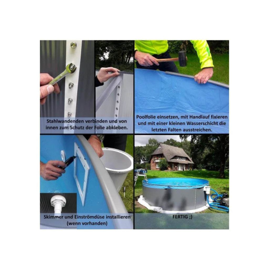 Bazén sa inštaluje pomocou spodných a horných líšt, do ktorých sa zasúva oceľová stena. Oba konce steny sa prepoja pomocou vnútorných a vonkajších líšt a skrutiek. Mrazuvzdornú fóliu sa pomocou ohybu upevní na hornú časť oceľovej steny a vytvaruje do bazéna podľa vizuálnych požiadaviek. Fólia je flexibilná a na mieru vyrobená pre tento typ bazéna (nie je potrebná žiadna úprava). Pre montáž krok za krokom sledujte pokyny v montážnom návode.