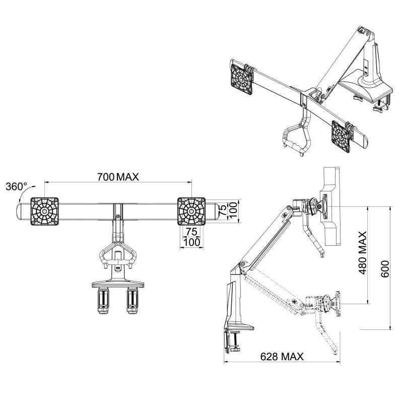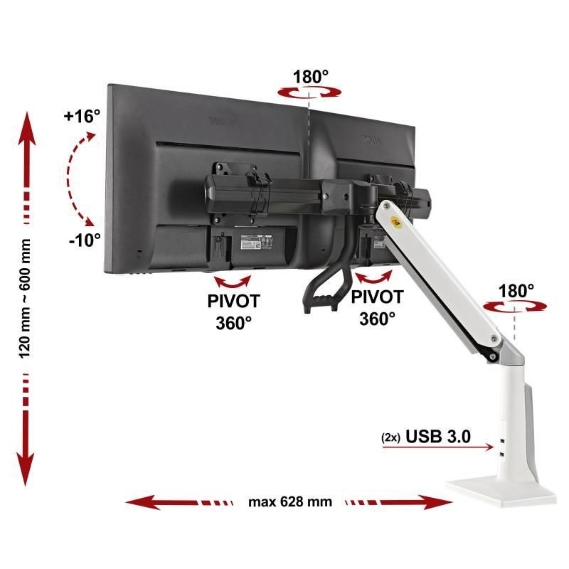 Stolný držiak na 2 monitory NB F27W Profesionálny stolný držiak na 2 monitory 19-27", otočný +/-180°, sklopný +16°/-10°, nastavenie výšky 120-600mm, vzdialenosť od uchopu podľa natočenia 0-628mm, 2x port USB 3.0, 2 typy stolných uchytov, systém vedenia káblov, VESA 75x75 a 100x100, nosnosť 12kg, biele prevedenie Držiak v bielom prevedení pre zavesenie dvoch monitorov vedľa seba, profesionálnej kvality a moderného dizajnu. Ideálny pomocník, ak potrebujete dať 2 monitory na stolný držiak vedľa seba, či už do roviny alebo do paraboly. Držiak je plne nastaviteľný - otočný, sklopný, výškovo polohovateľný, funkcia PIVOT na natočenie monitorov do horizontálnej alebo vertikálnej polohy. Pod monitorami je madlo pre veľmi jednoduché polohovanie jednou rukou - kedykoľvek ihneď zmeníte polohu monitorov jednoducho, rýchlo a bez použitia akýchkoľvek náradí. Držiak je možné uchytiť na stolové dosky alebo akékoľvek vodorovné plochy o sile 10mm až 95mm, uchytenie je možné buď na okraj (2 svorky) alebo kamkoľvek do priestoru (potrebný otvor 10-50mm). Rameno držáka má systém pre skryté vedenie káblov, na stolnom uchytení sú navyše 2 porty USB 3.0 Nastaviteľný držiak na dva monitory 19-27 palcov, umiestnenie vedľa seba do paraboly alebo roviny, plne polohovateľný ľahko jednou rukou - NB F27W Technické údaje: zaťaženie 6kg až 12kg (hmotnosť 1 monitora 3-6kg) ideálny na zavesenie 2 monitorov s uhlopriečkou 19" až 27" držiak podporuje VESA štandardy pre uchytenie monitorov 75x75 a 100x100 plne polohovateľný, jednoduchá zmena polohy jednou rukou pomocou madla otočenie do strán +/- 180° naklopenie nahor až 16°, nadol až 10° fukcia PIVOT - možnosť otočenia každého monitora z horizontálnej do vertikálnej polohy a naspäť vzdialenosť od uchopu max. 628mm výškové polohovanie 120mm až 600mm monitory sú vedľa seba v miernej parabole uchyty monitorov sú posuvné, monitory môžu byť úplne pri sebe (bez medzery) alebo s medzerou madlo pre jednoduchú zmenu polohy držiaku (je odnímateľné, ak ho nechcete) maximálna vzdialenosť medzi stredmi monitorov 700mm vestavené 2 porty USB 3.0 v stolnom uchytení systém pre skryté vedenie káblov ramienkom držiaka výškové polohovanie zabezpečuje plynová pružina s nastaviteľnou tuhosťou uchytenie na stoly alebo vodorovné povrchy o sile 10mm až 95mm uchytenie na okraj dosky (2 svorky) alebo do priestoru (potrebný otvor s priemerom 10mm až 50mm) profesionálne spracovanie TOP kvalita farebné prevedenie biele záruka 3 roky Biely držiak na dva monitory NB F27W Držiak podporuje VESA štandardy pre uchytenie monitorov s VESA: VESA 75x75 VESA 100x100 Profesionálny držiak najvyššej kvality s možnosťou okamžitej zmeny polohy monitorov bez použitia náradia, ľahko, rýchlo len jednou rukou. Pekný dizajn v bielom prevedení, systém pre ukryté vedenie káblov, integrované 2 porty USB 3.0