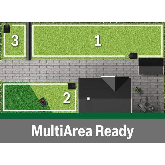Vďaka funkcii MultiArea si kosačka Indego môže do pamäti uložiť až tri trávnaté plochy (do celkovej rozlohy 500 m2).