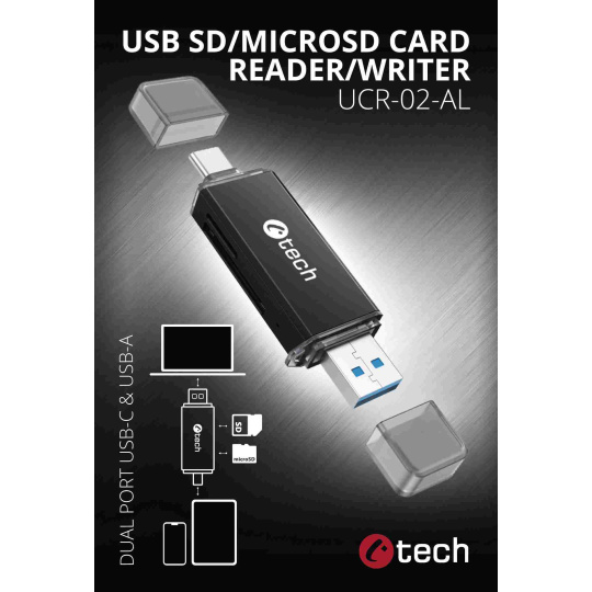 Univerzálna kompaktná USB čítačka pamäťových kariet C-tech UCR-02-AL sa vďaka dualnému konektoru a širokej podpore podporovaných kariet typu SD stane vítaným rozšírením vášho počítača, notebooku či mobilného zariadenia. Čítačka podporuje všetky súčasné verzie SD a microSD kariet vrátane SDXC a microSDXC s kapacitou až 512GB. K zariadeniu ju ľahko pripojíte pomocou USB-A alebo USB-C konektoru a svojmu používateľovi ponúkne prenos dát rýchlosťou až 5Gbps. Kovové telo čítačky nielen skvele vyzerá, ale zvyšuje aj jej odolnosť. Oba konektory sú pri prenose chránené krytkami. Vďaka USB 3.0 rozhraniu dosahuje čítačka výrazne vyšších prenosových rýchlostí u kariet oproti čítačkám s USB 2.0 rozhraním. Čítačka poteší možnosťou súčasnej práce s kartami vo oboch slotoch a priameho kopírovania medzi nimi. Nechýba široká podpora operačných systémov a podpora Plug and Play štandardu, vďaka ktorému stačí iba pripojiť k zariadeniu a počkať na automatickú inštaláciu ovládačov a následne začať čítačku plne využívať. Pomocou funkcie OTG ju ľahko prepojíte s vaším mobilným telefónom.