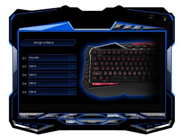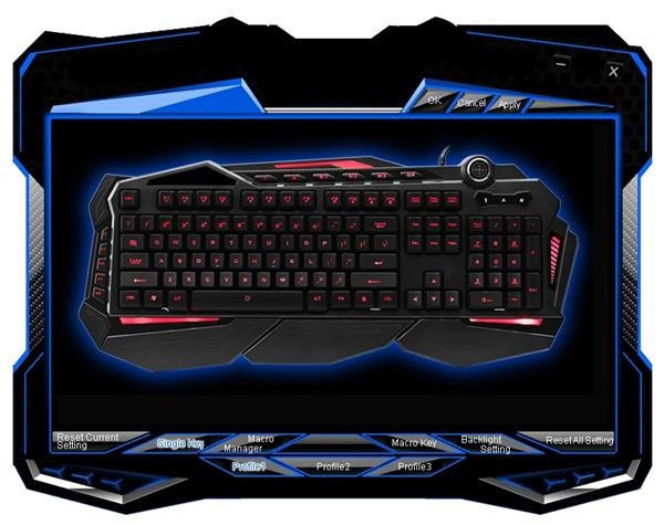 3 profily - na klávesnici nájdete tlačidlá na prepínanie medzi 3 nezávislými profilmi. Pre každý profil môžete individuálne nastaviť farbu podsvietenia, jeho intenzitu, makrá a preddefinované klávesy...