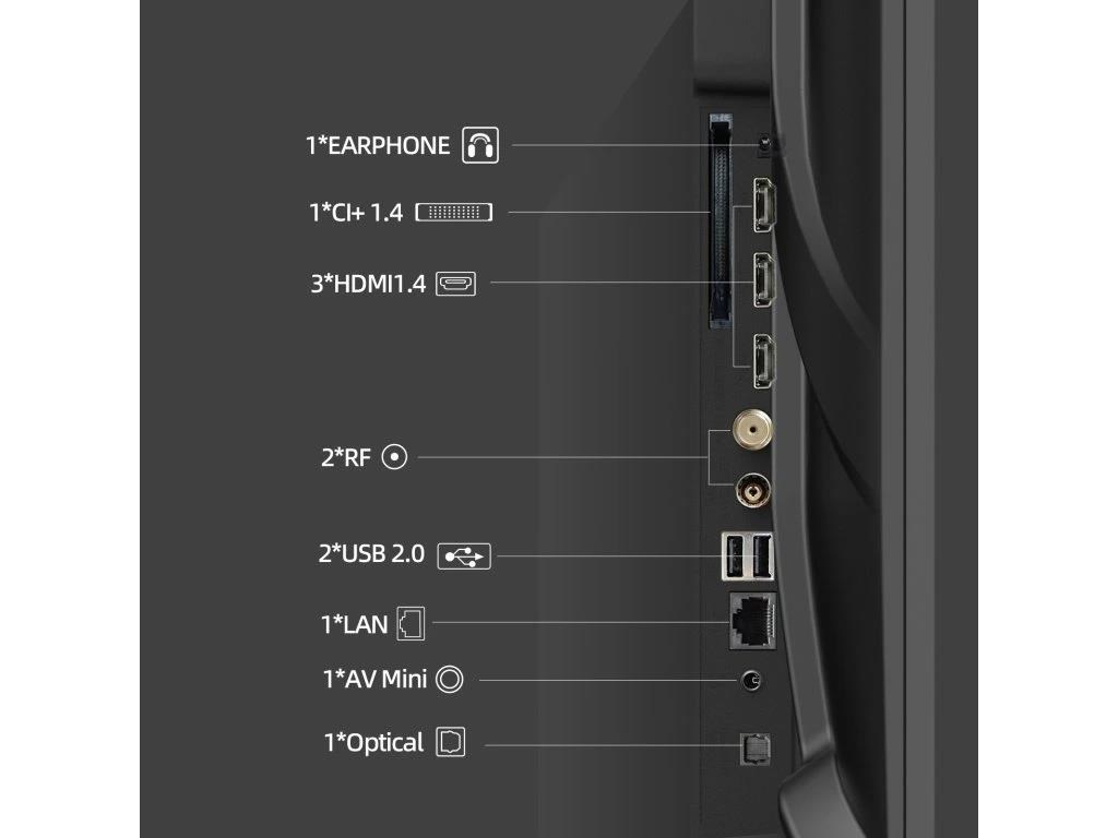 | Vstupy a výstupy: | AV vstup mini, CI+, slúchadlový vstup 3.5 mm, digitálny audio výstup, HDMI 1.4, USB 2.0, LAN, antény RF a LNB |