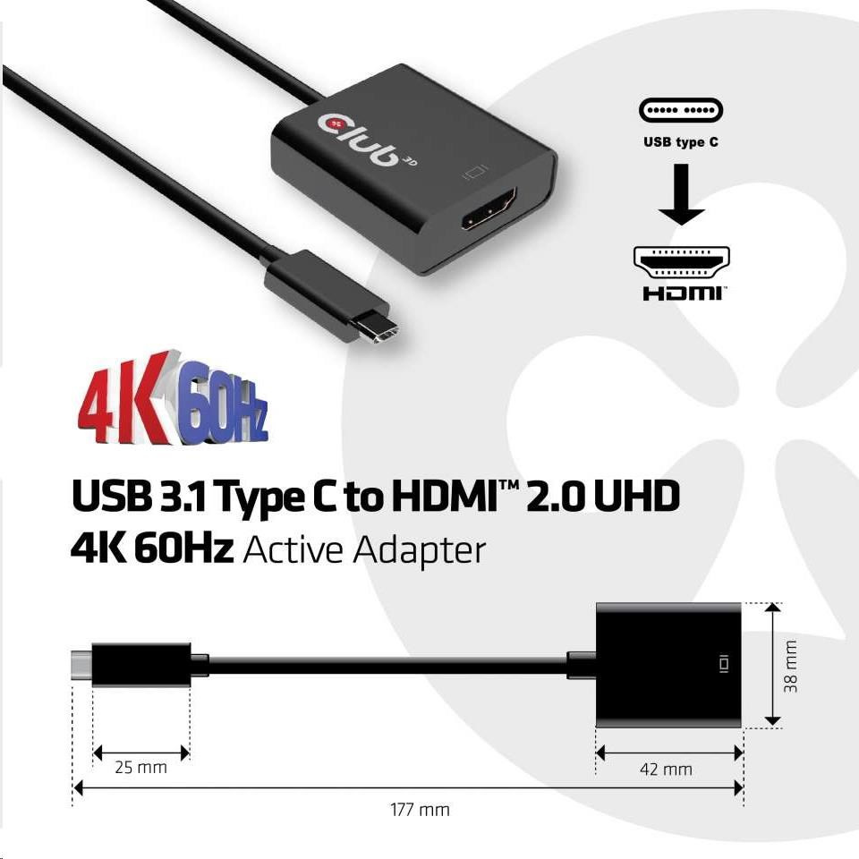 Club 3D CAC-2504 je aktívny prevodník signálu HDMI ™. Adaptér USB 3.1 Type C na HDMI ™ 2.0 UHD 4K 60 Hz je najjednoduchším riešením pre pripojenie zdrojového zariadenia, ktoré obsahuje konektor USB 3.1 Type C s alternatívnym režimom DisplayPort ™ k (U)HD monitoru, televízoru alebo projektoru s rozhraním HDMI ™ 2.0. Adaptér je kompaktný a vysoko prenosný. Napájaný portom USB-C, adaptér nevyžaduje žiadne externé napájanie a je ideálny pre použitie s notebookmi a ultrabookmi.