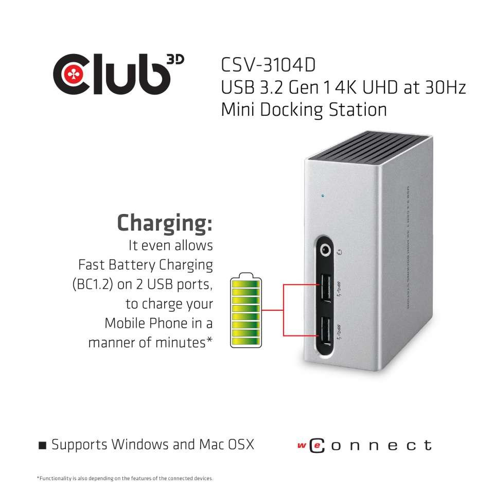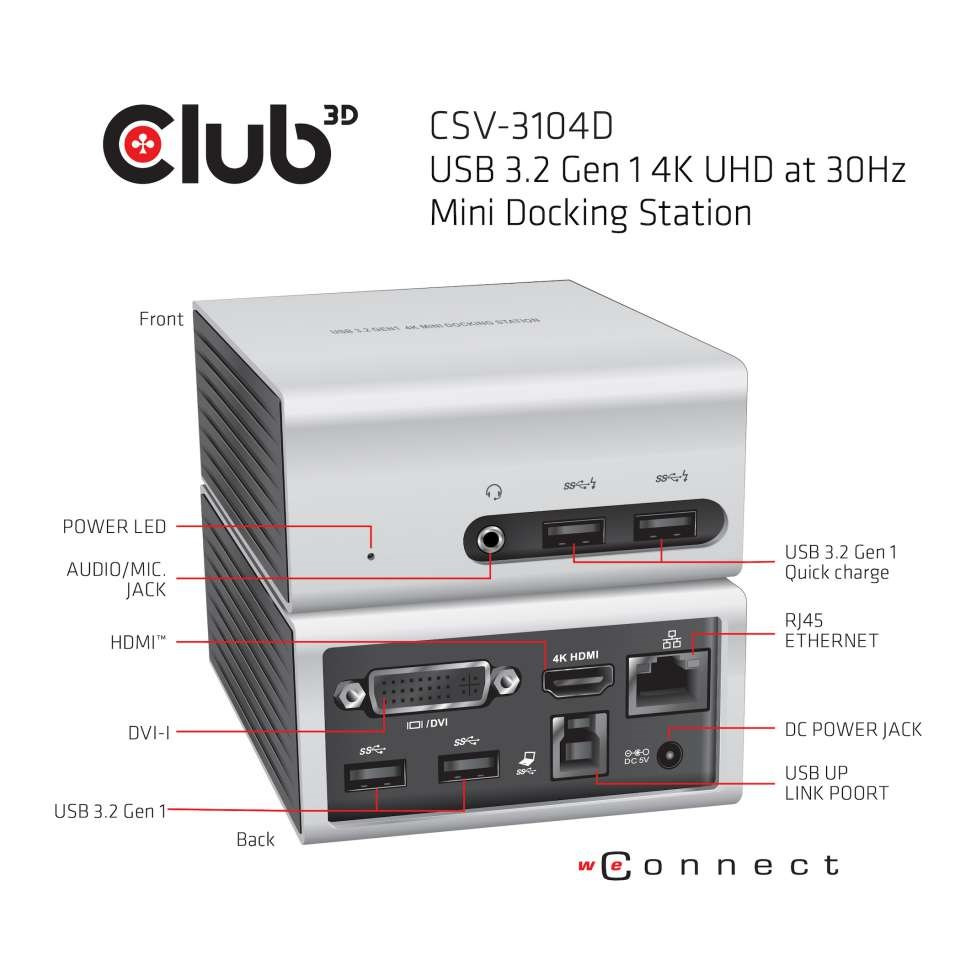 Vďaka svojmu pohodlnému a kompaktnému dizajnu je Club 3D USB 3.1 Gen 1 4K UHD Mini dokovacia stanica je všestranný nástroj, ktorý vám poskytne maximálnu funkčnosť vašej malej náhrady stolného počítača alebo mobilného spoločníka.
