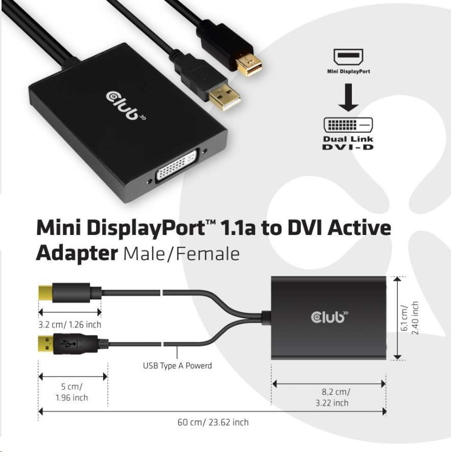 Club3D Adaptér aktivní Mini DisplayPort 1.2 na Dual Link DVI-D Active Adapter, pouze HDCP, 4k30Hz, 60cm