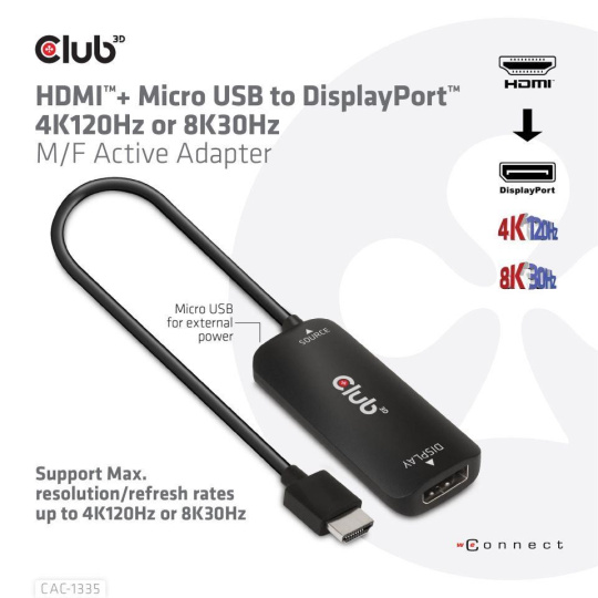 Club3D Adaptér HDMI + Micro USB na DisplayPort 4K120Hz/8K30Hz, Active Adapter M/F