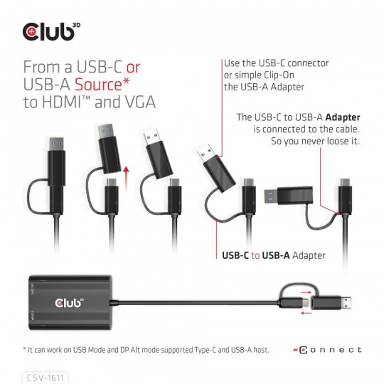 Adaptér Club 3D CSV-1611 USB Gen1 Type-C/-A na duálny HDMI™ (4K/30Hz) a VGA (1080/60Hz) je duálny adaptér, ktorý poskytuje najmodernejšie a najúčinnejšie riešenie na rozšírenie jedného portu USB Type-C alebo Type-A na displeje HDMI™ a VGA. Podporuje jeden HDMI™ 4K/30Hz a VGA 1080P/60Hz alebo duálny 4K/30Hz + VGA 1080P/60Hz simultánny výstup rôznych videí. Môže pracovať v režime USB a v režime DP Alt s podporou hostiteľa typu C a USB-A. Duálny video výstup na MacBooku s M1. Podporuje USB Gen1 s maximálnou rýchlosťou prenosu dát 5 Gb/s. Zariadenie sa napája prostredníctvom hostiteľského pripojenia USB typu A alebo typu C. Nie je potrebné žiadne externé napájanie.