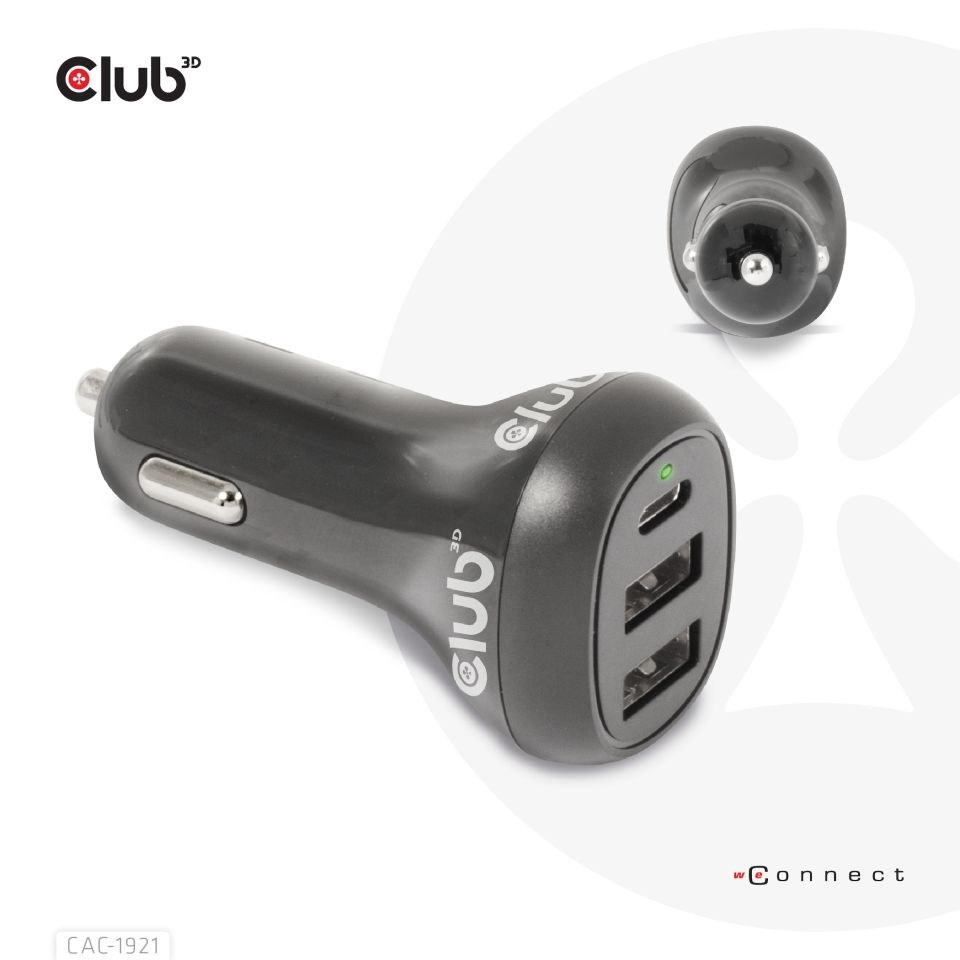 Produkt Club 3D CAC-1921 je vysoko výkonná nabíjačka do auta s módnym dizajnom. S touto nabíjačkou môžete nabíjať akékoľvek zariadenia (napr.: digitálne fotoaparáty, PDA, mobilné telefóny, USB príslušenstvo) s autom, keď je to potrebné. Je vybavená tromi USB konektormi (jeden konektor USB Type-C a dva konektory USB Type-A) na napájanie. Tento produkt umožňuje nabíjanie troch zariadení súčasne a poskytuje maximálny výkon 36 wattov. Port USB Type-C je špeciálne navrhnutý pre zariadenia podporované Type-C. Uistite sa, prosím, že používate káble s správnym výkonom od Club 3D. Odporúčame používať minimálne 60W káble, aby ste sa uistili, že optimálne využívate výhody tejto nabíjačky. Je to užitočné a pohodlné použitie!