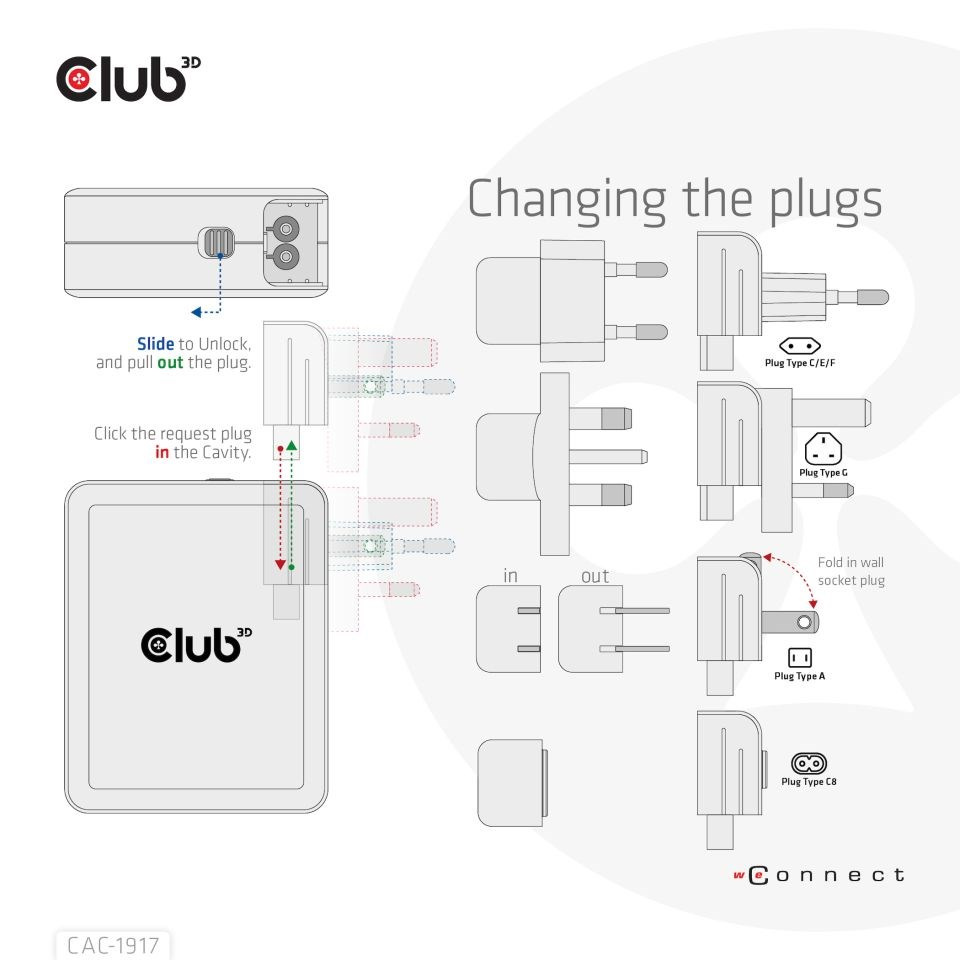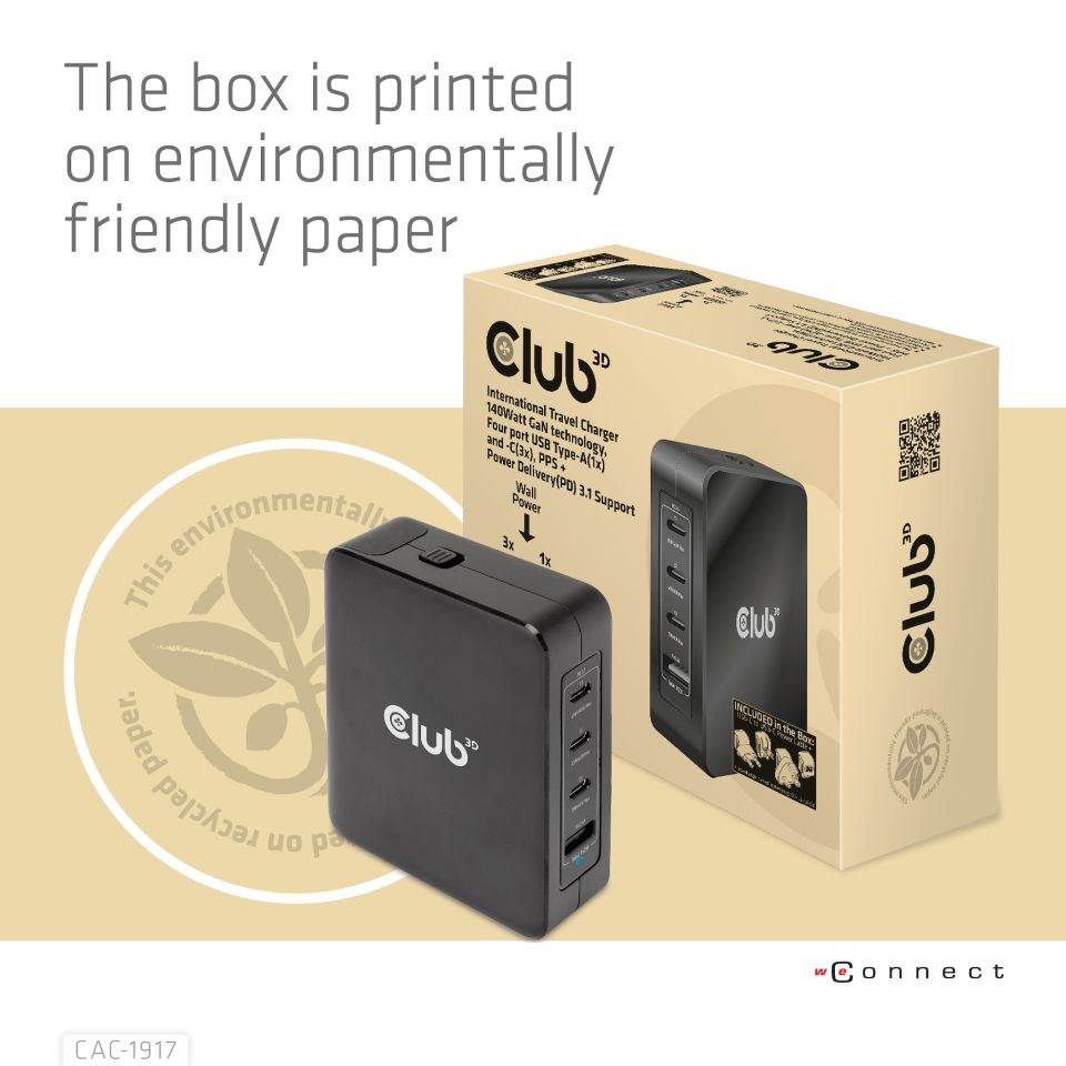 Medzinárodná cestovná nabíjačka Club 3D CAC-1917 140W GaN technológia, 4 porty USB Type-A (1x) a -C (3x), podpora PPS + Power Delivery (PD) 3.1 je vysoko výkonná cestovná nabíjačka s módnym dizajnom.