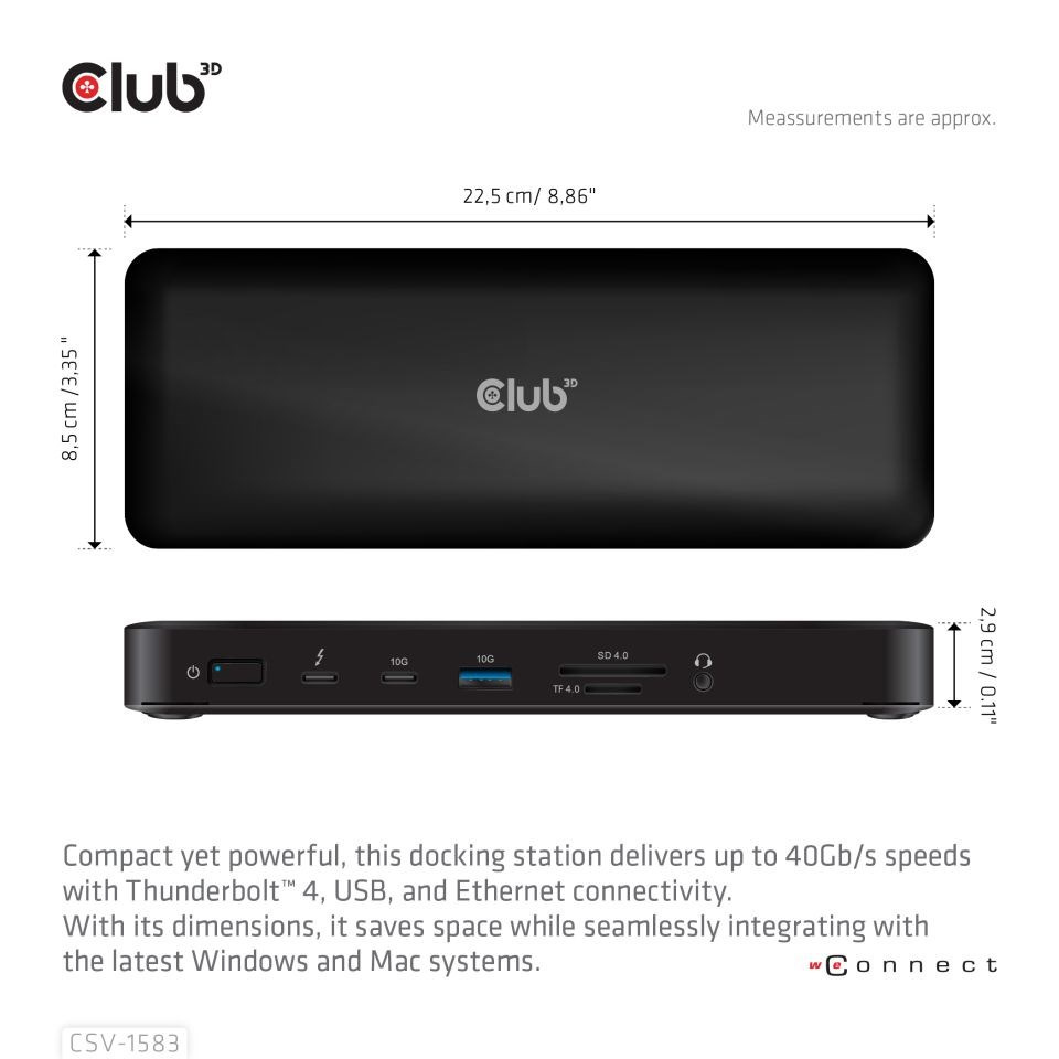 Club 3D CSV-1583 je dokovacia stanica Quadra Displays 16 v 1 s certifikáciou Thunderbolt 4 a DisplayLink, ktorá poskytuje najpokročilejšie, najúčinnejšie a najvšestrannejšie dostupné I/O riešenie s rýchlosťou až 40 Gb/s pre dáta a video. Zo všetkých 7 video portov umožňuje výstup max. 3 videí pri pripájaní k M1, M2 a M3; 4 videá pri pripájaní k M1 Pro/Max, M2 Pro/Max, M3 Pro/Max a ďalším notebookom radu Mac a notebookom Windows.