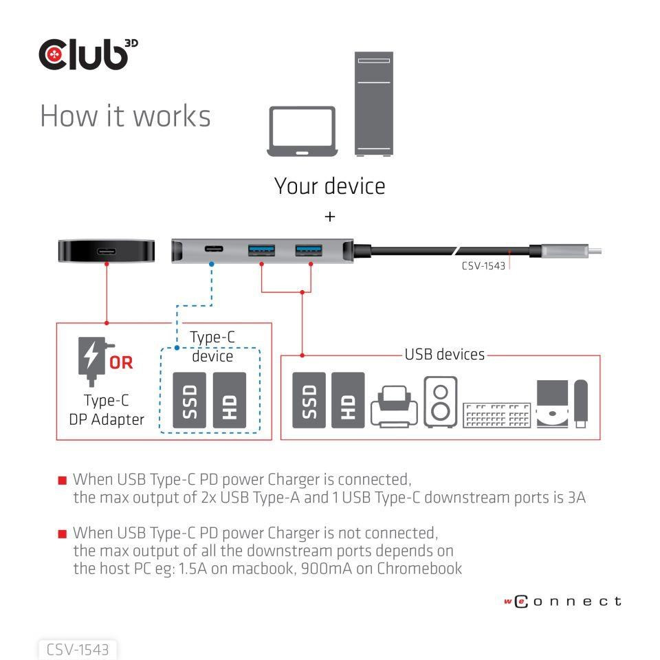 Club 3D CSV-1543 je nabíjací rozbočovač USB Gen2 Type-C PD na 2x porty Type-C 10G a 2x porty USB Type-A 10G.Dva porty USB typu A sú určené na prenos dát a jeden z dvoch portov USB typu A môže poskytovať 1.5A nabíjanie pre pripojené zariadenia USB typu A (mobilné telefóny, tablety, U-disky atď.). Jeden z dvoch portov USB typu C je určený na prenos dát a nabíjanie pripojeného zariadenia USB typu C, druhý port USB typu C podporuje prenos dát aj PD3.0 nabíjanie. Môže fungovať na akomkoľvek hostiteľovi USB typu C (PC, notebook, tablet, mobilný telefón atď.), ktorý podporuje režim DP Alt.