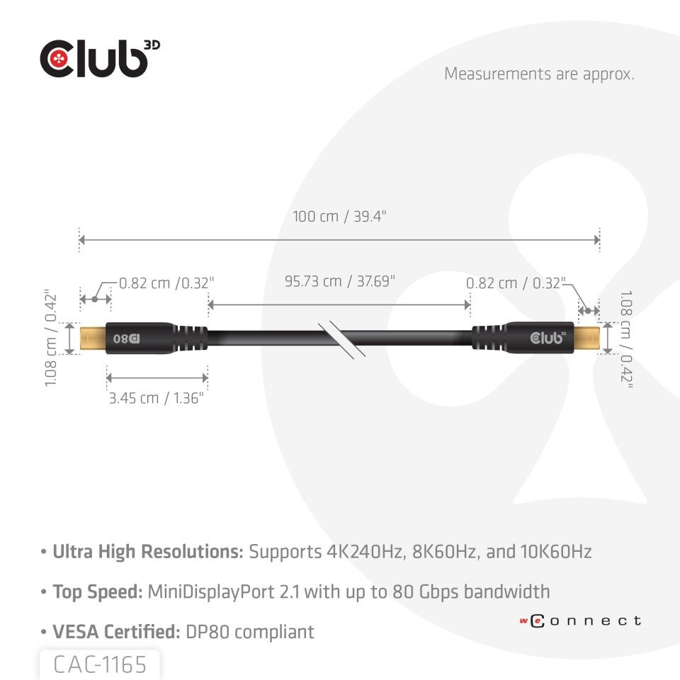 Club 3D CAC-1165 MiniDisplayPort DP80™ koaxiálny kábel Certifikovaný kábel Vesa, 4K240Hz, 8K60Hz alebo 10K60Hz 1m umožňuje pripojenie vášho (hernému) PC alebo notebooku s podporou MiniDisplayPort k monitoru s ultra vysokým rozlíšením alebo inému zariadeniu s podporou MiniDisplayPort.