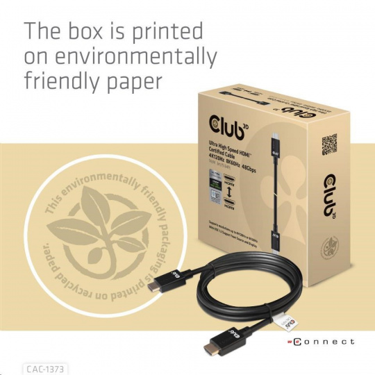 CAC-1373 - Ultra vysokorýchlostný HDMI™ kábel Club 3D je skonštruovaný tak, aby zvládol najvyššiu kvalitu video a audio signálov. HDMI™ má zvýšenú šírku pásma 48 Gb/s. Zvýšenie maximálnej šírky pásma v porovnaní s predchádzajúcimi verziami sa dosiahlo zvýšením prenosovej rýchlosti dátových kanálov (zo 6 Gb/s na 12 Gb/s) a počtu kanálov (z 3 na 4). To umožňuje podporu rozlíšení až do 10K pri 120 Hz!