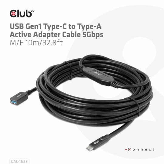 Club 3D CAC-1538 USB Gen1 Type-C to Type-A Active Adapter Cable 5Gbps M/F 10m / 32.8ft pripojí váš notebook, tablet alebo telefón s výstupom USB typu C k vašim obľúbeným existujúcim periférnym zariadeniam, príslušenstvu a nabíjačkám s bežným konektorom USB typu A. Umožňuje prenos dát a napájanie cez jeden kábel a oboma smermi. Tento kábel podporuje USB Gen1. Prenos dát SuperSpeed+ až do rýchlosti 5 Gb/s a výstup až 900 mA na následné nabíjanie alebo napájanie notebooku, tabletu alebo smartfónu s rozhraním USB typu A.