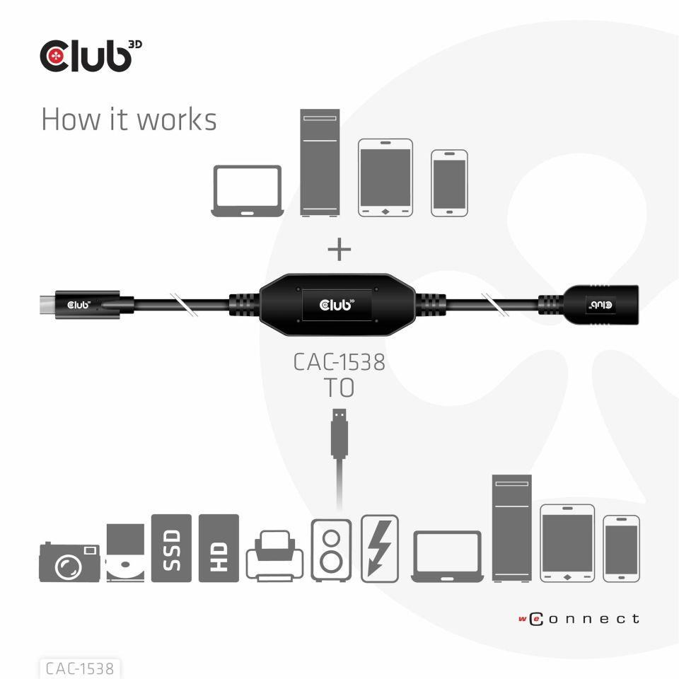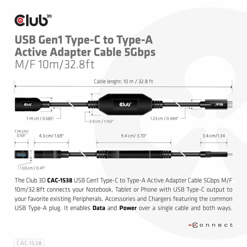 Club 3D CAC-1538 USB Gen1 Type-C to Type-A Active Adapter Cable 5Gbps M/F 10m / 32.8ft pripojí váš notebook, tablet alebo telefón s výstupom USB typu C k vašim obľúbeným existujúcim periférnym zariadeniam, príslušenstvu a nabíjačkám s bežným konektorom USB typu A. Umožňuje prenos dát a napájanie cez jeden kábel a oboma smermi. Tento kábel podporuje USB Gen1. Prenos dát SuperSpeed+ až do rýchlosti 5 Gb/s a výstup až 900 mA na následné nabíjanie alebo napájanie notebooku, tabletu alebo smartfónu s rozhraním USB typu A.