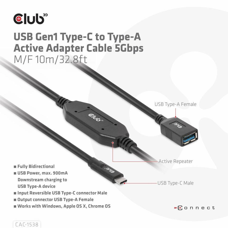 Club3D Kabel USB-C na USB-A, Aktivní adaptér/kabel, 5 Gbps (M/F), 10m