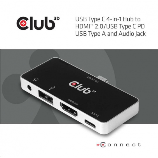 CSV-1591 - Club 3D Hub je rozbočovač 4 v 1 USB typu C s rozhraním HDMI™, USB typu A 2.0, 3.5 mm audio a nabíjanie cez USB typu C PD, dizajn dokonale vyhovuje všetkým zariadeniam s režimom DP Alt. S týmto rozbočovačom si môžete vychutnať video s ultra vysokým rozlíšením hostiteľa na veľkej obrazovke, vychutnať si fantastickú hudbu, prenášať USB 2.0 a pripojte adaptér USB typu C PD na nabíjanie hostiteľa.