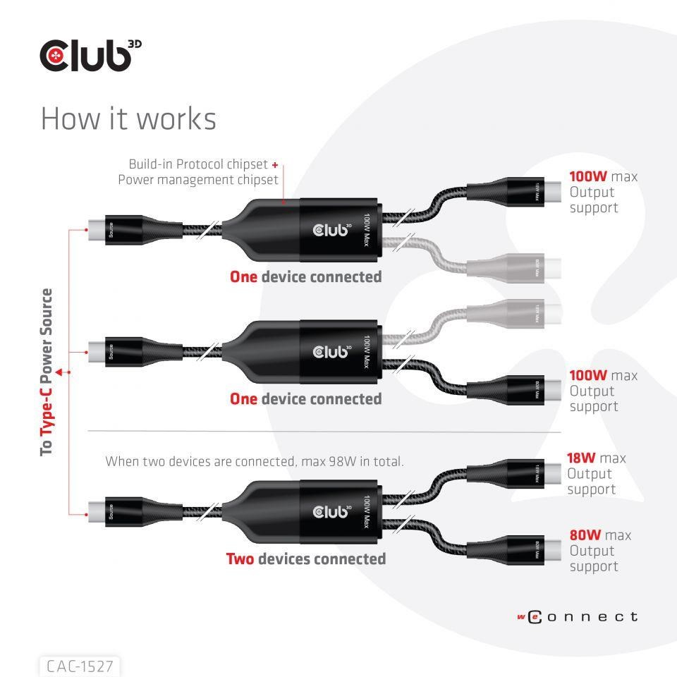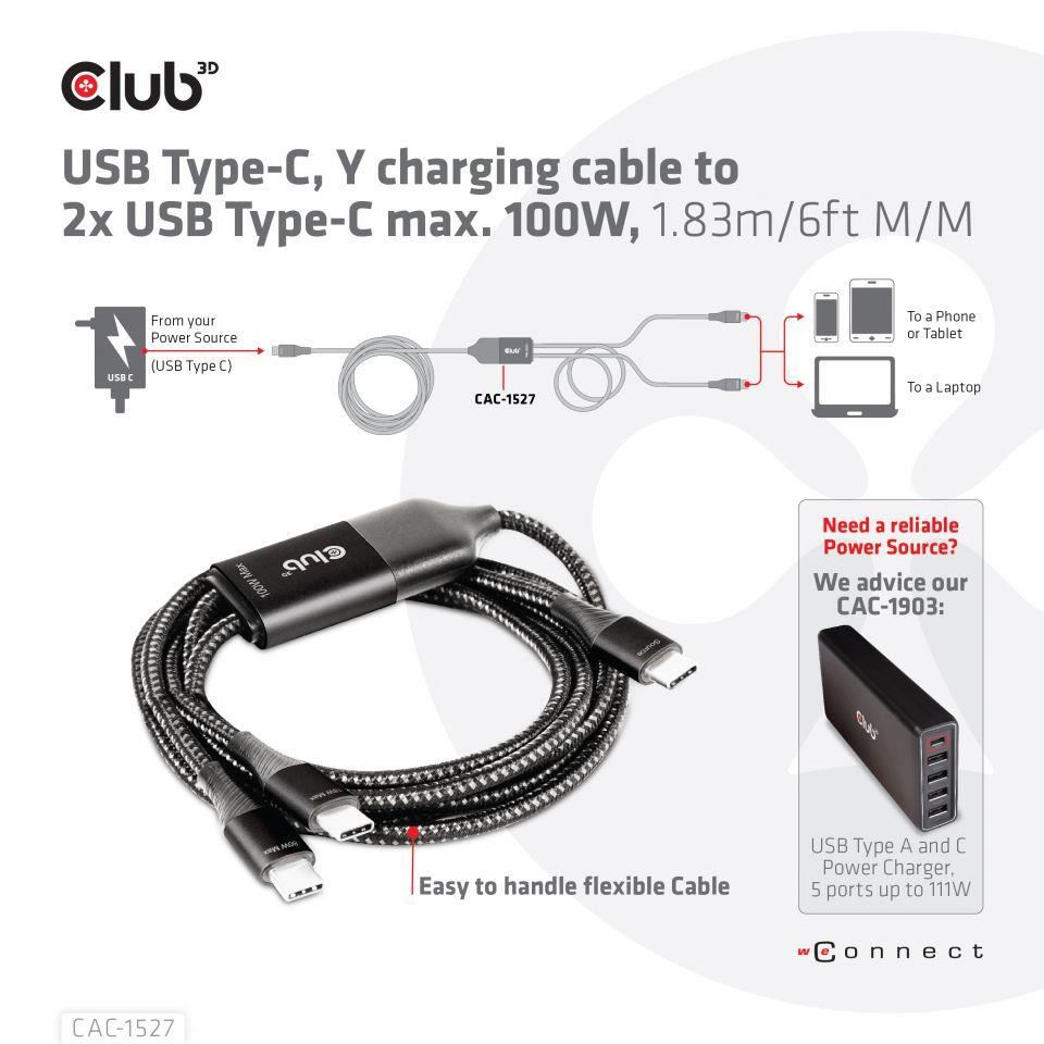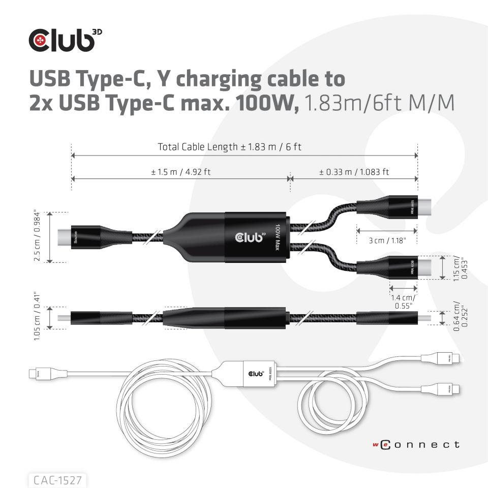 Nabíjací kábel Club3D USB Type-C, nabíjací kábel Y na 2x USB Type-C max. 100W, 1.83m/6ft M/M