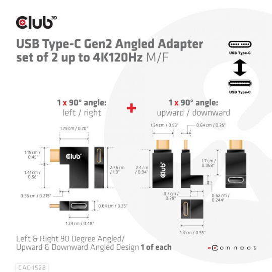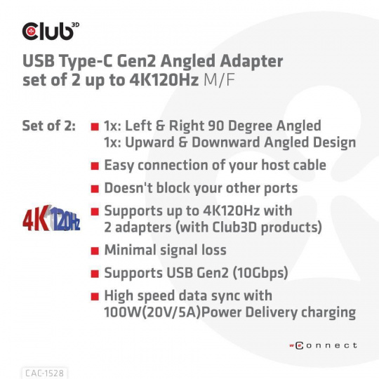 Club 3D CAC-1528 USB Type-C Gen2 Angled Adapter set of 2 up to 4K120Hz M/F je všestranná sada uhlových konektorových adaptérov poskytujúca riešenia pre správu káblov. Pomocou adaptérov s jedným alebo oboma konektormi sa môžete vyhnúť blokovaniu iných portov na hostiteľskom zariadení. Aj v prípade displejov so vstupom USB typu C to môže byť jednoduché riešenie, aby ste neblokovali iné porty a/alebo neohýbali káble. Táto sada obsahuje 1 adaptér od každého a je univerzálna na použitie, prenos dát, videa a napájanie do 100 W (20 V/5 A). Adaptéry sú overené s produktmi Club 3D a podporujú frekvenciu až do 4K120 Hz. Podporuje USB Gen2 s rýchlosťou prenosu dát až 10 Gb/s.