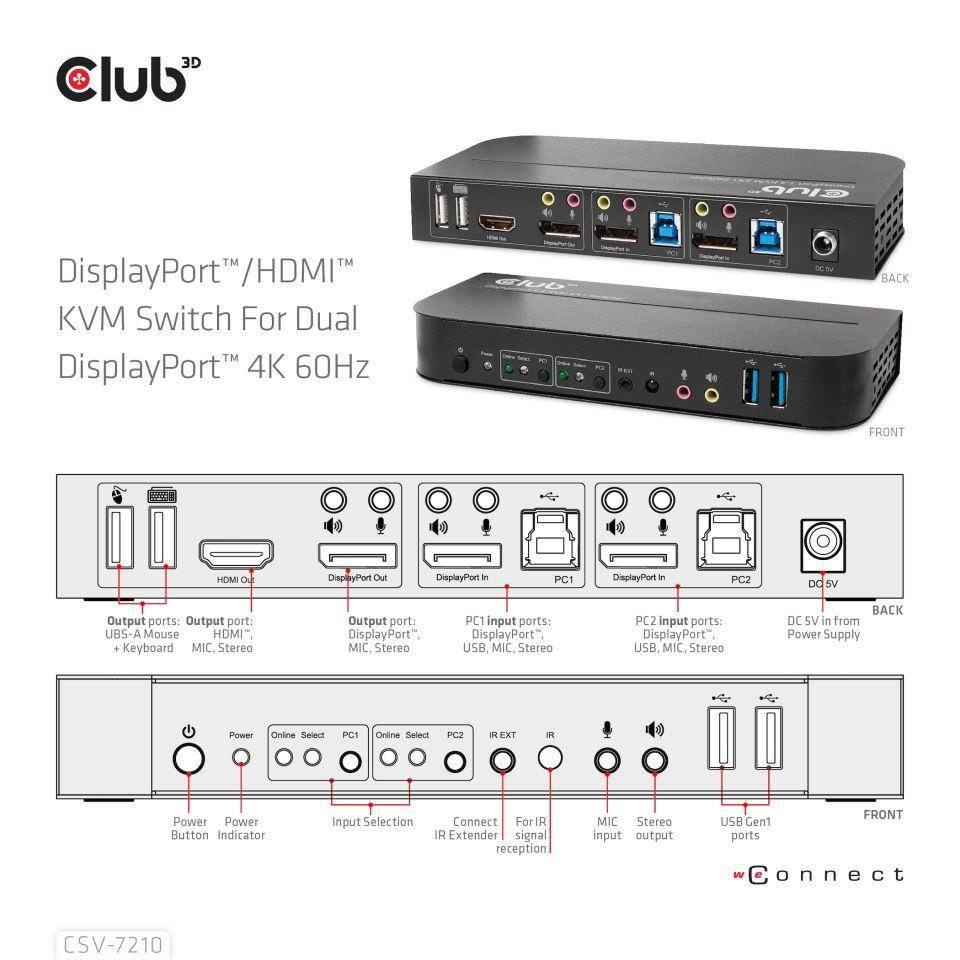 CSV-7210 je vysoko výkonný prepínač KVM (klávesnica, video a myš) s rozhraním DisplayPort™. Presmeruje videá s vysokým rozlíšením až do 4096 × 2160 pri 60 Hz rozlíšení a zvuk z akéhokoľvek zdroja DisplayPort™ na akýkoľvek displej s podporou HDMI™ alebo DisplayPort™. Tento prepínač DisplayPort™ KVM má nielen funkciu prepínania stlačením tlačidla, ale aj inteligentnú funkciu a funkciu hot pluggable.