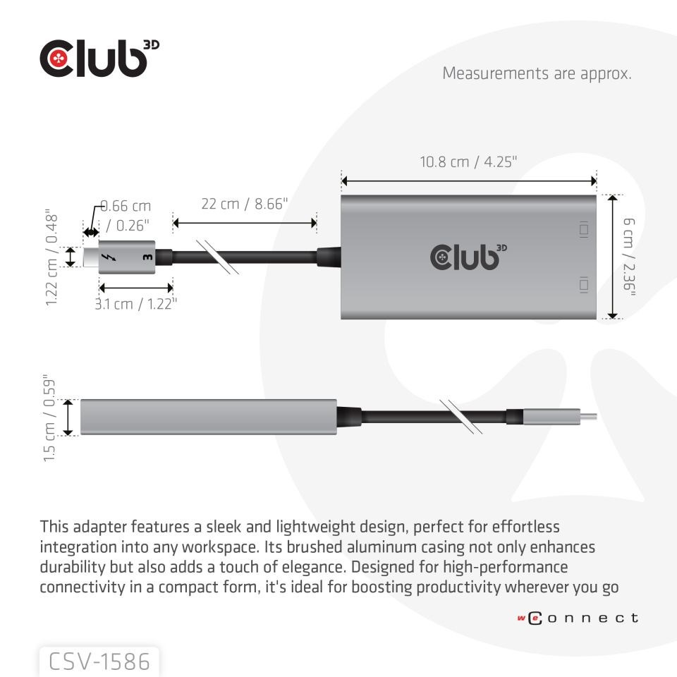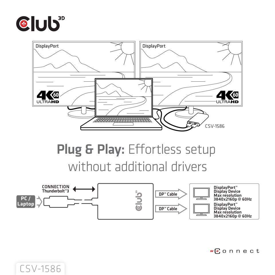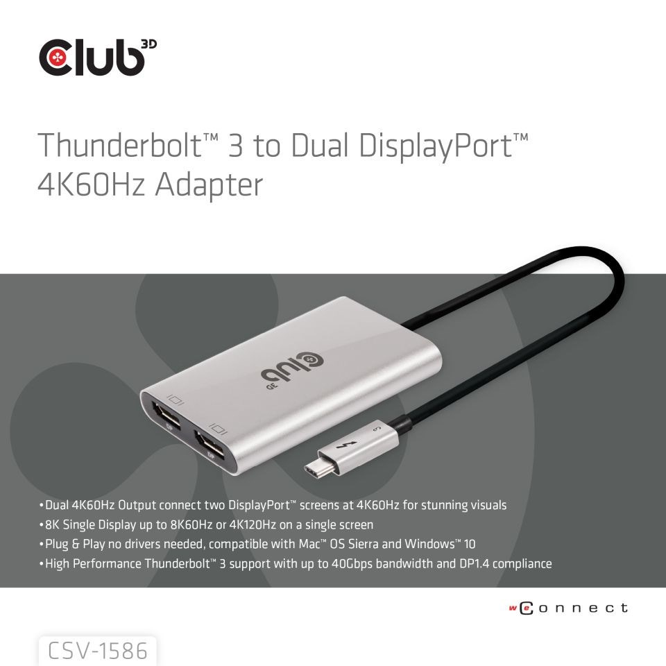 Adaptér Club 3D CSV-1586 Thunderbolt™ 3 na Dual DisplayPort™ 4K60Hz umožňuje používateľom ľahko pripojiť dve obrazovky Displayport™ @ 4K60Hz k akémukoľvek zariadeniu s rozhraním Thunderbolt™ 3. Podporované výstupné rozlíšenie je až duálne 4K60Hz alebo 8K60Hz/4K120Hz. jediný displej. Je plne Plug & Play, takže nie je potrebné inštalovať ovládače. Tento štýlový adaptér má krásny kryt z brúseného hliníka, vďaka ktorému je pevný a ľahký.