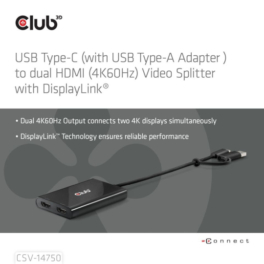 Club 3D CSV-1475 USB-C/A) na duálny HDMI (4K60Hz) Video Splitter s DisplayLink® poskytuje najpokročilejšie a najefektívnejšie riešenie. Podporuje max. jeden 4K60Hz alebo duálny 4K60Hz s podporou Extended Desktop.