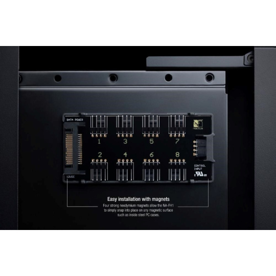 NA-FH1 je vysoko kvalitný, múdro chránený 8-kanálový rozbočovač ventilátorov PWM, ktorý umožňuje spustiť a riadiť až osem ventilátorov PWM súčasne prostredníctvom jediného hlavičky ventilátora PWM na základnej doske alebo samostatných regulátorov, ako je voliteľný NA-FC1. Ventilátory bez PWM je možné riadiť nastavením vstupného napätia. Vďaka podpore 12V aj 5V ventilátorov s 4pólovými PWM a 3-pólovými konektormi je NA-FH1 vysoko flexibilný a vhodný ako pre prostredie PC, tak aj pre ďalšie aplikácie založené na 12V alebo 5V. Môže byť napájaný buď cez vstup S-ATA (pre 12V ventilátory, až 54 W), alebo cez 4-pólový vstup PWM (pre 5V a 12V ventilátory, až 24 W), pričom oboje je chránené proti prepätiu samonastavovacou poistkou pre maximálnu bezpečnosť aj v prípade skratov na pripojených zariadeniach alebo káblach.
