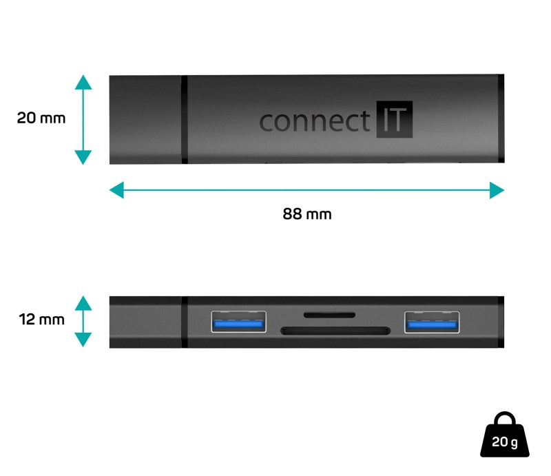 CONNECT IT Hub Compact 4v1, 2xUSB 3.0, 1xSD, 1xMicroSD, externí, černá