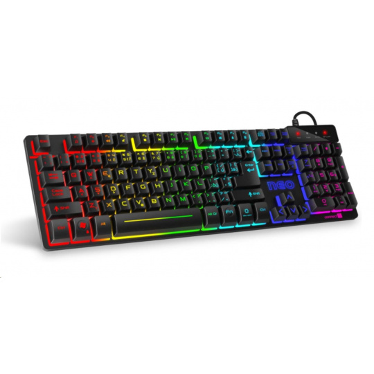 Profesionálna herná klávesnica série NEO pre hráčov počítačových hier v českom a slovenskom rozložení s 9 režimami farebného dúhového podsvietenia a štvorstupňovou reguláciou intenzity podsvietenia. K dispozícii je 12 multimediálnych tlačidiel.