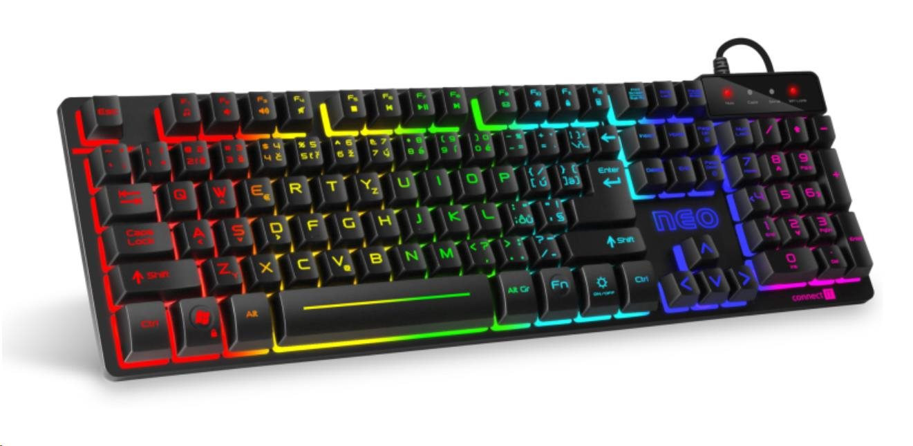 Profesionálna herná klávesnica série NEO pre hráčov počítačových hier v českom a slovenskom rozložení s 9 režimami farebného dúhového podsvietenia a štvorstupňovou reguláciou intenzity podsvietenia. K dispozícii je 12 multimediálnych tlačidiel.
