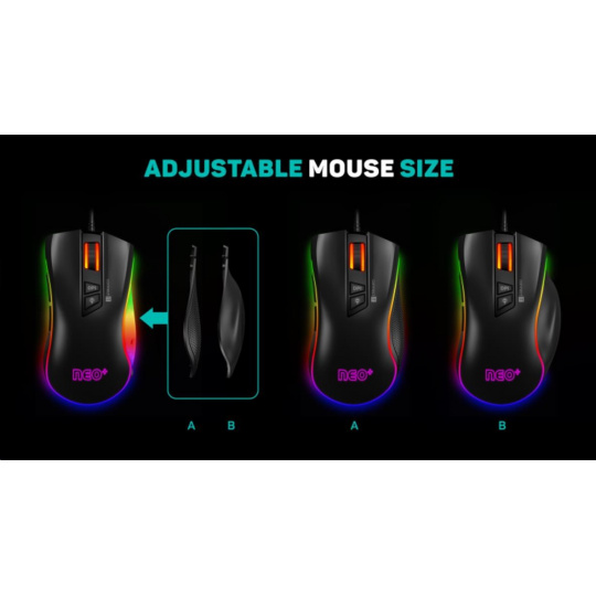 Profesionálna herná myš z edície NEO+ SERIES pre hráčov počítačových hier s ôsmimi nastaviteľnými tlačidlami, presným optickým snímačom a plnou podporou používateľských makier.
