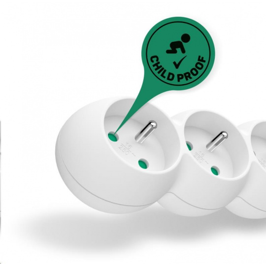 - Detská ochrana pre všetky zásuvky (zásuvky sú prístupné len pri súčasnom vložení oboch vidlíc, takže ich nemožno vložiť jednotlivo, napr.