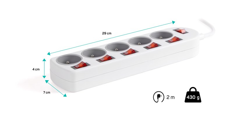 Prodlužovací káblový prívod na 230 V je vybavený hlavným sieťovým vypínačom, ktorý pri vypnutí úplne odpojí od prívodu elektrickej energie všetky zapojené spotrebiče naraz. Prodlužovací kábel tiež disponuje vypínačmi pre každú zásuvku zvlášť, sami si zvolíte, ktoré zásuvky budú kedy zapnuté alebo vypnuté bez potreby odpojenia pripojovacieho kábla od elektrospotrebiča. Extra výbavou je detská ochrana všetkých zásuviek – zásuvky sú prístupné iba v prípade zasunutia oboch vidlíc naraz, teda nie je možné zasunúť jednotlivé, napríklad skrutkovač alebo pletacia ihlica. Vďaka pootočeniu zásuviek o 45° je možné používať aj objemnejšie napájacie adaptéry alebo uhlové koncovky.