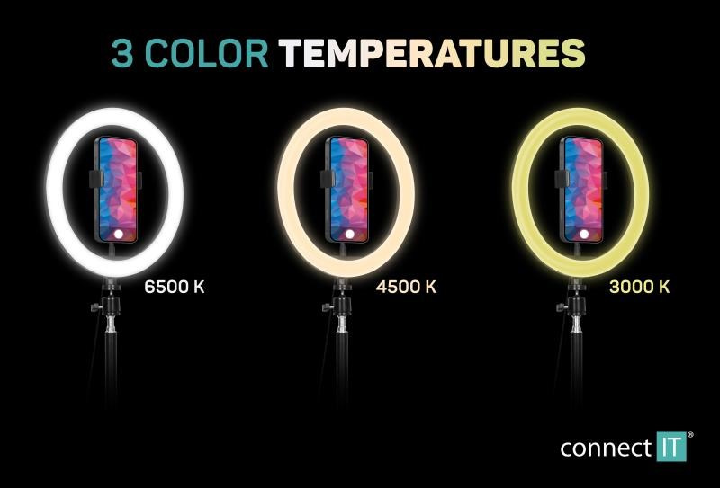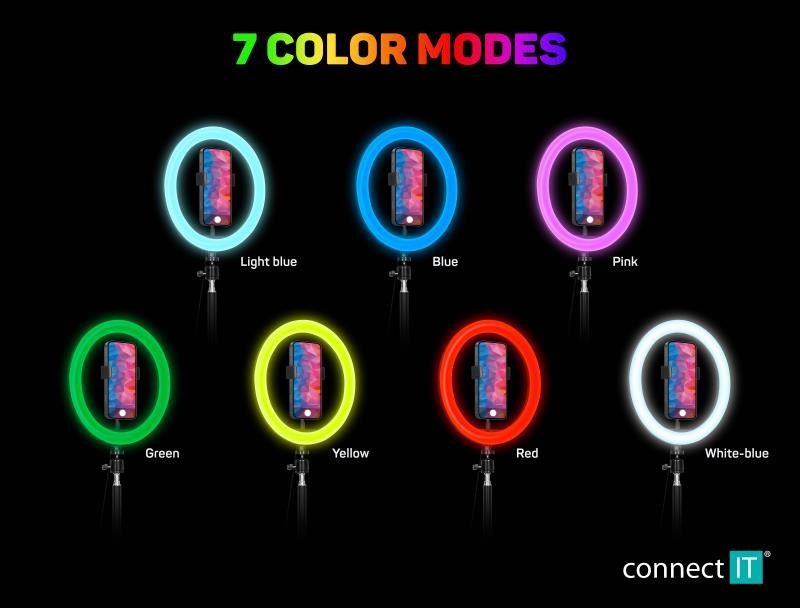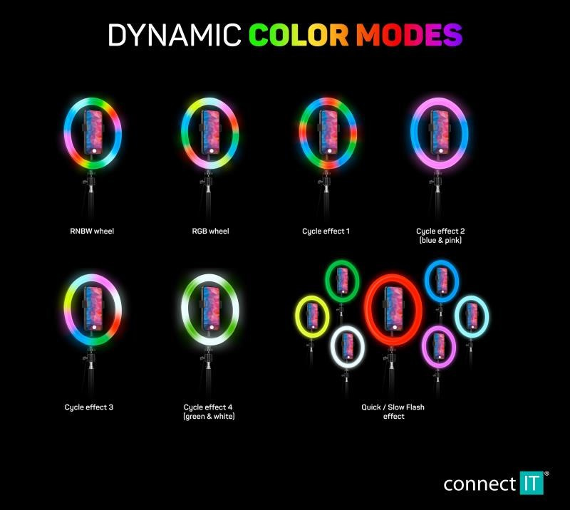 Kruhové selfie LED svetlo "Selfie10RGB" s flexibilným držiakom na mobilný telefón, statívom s guľovou hlavou a diaľkovým ovládaním pre domáce i profesionálne použitie umožňuje nastaviť 7 statických farieb, 8 dynamických efektov a farebnú teplotu svetla v 3 rôznych úrovniach (3200/4300/5500 K).