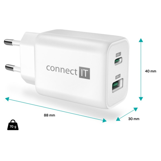 CONNECT IT Wanderer2 GaN nabíjecí adaptér 1×USB-C + 1xUSB-A, 33W PD, bílá