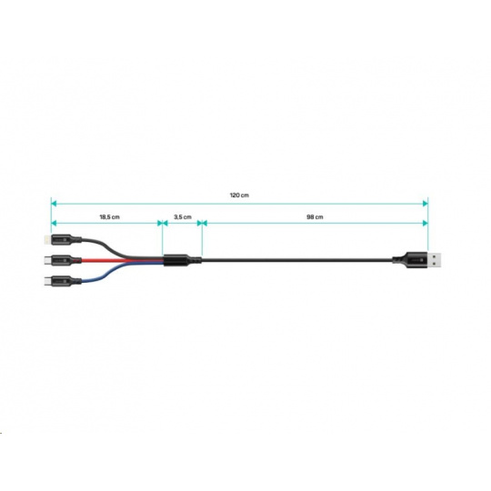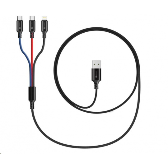 Univerzálny nabíjací kábel 3 v 1 na nabíjanie zariadení s konektormi Micro USB, Lightning a USB-C (typ C) umožňuje nabíjať až tri zariadenia súčasne s podporou rýchleho nabíjania pomocou max. prúd 2 A. Špeciálne predĺženie manžety konektorov Micro USB, Lightning a USB-C (typ C) zabezpečuje lepšiu dostupnosť k nabíjacím portom mobilných telefónov v puzdrách.