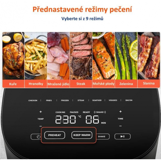 - PREDHRIATIE - predhreje fritézu, čím urýchľuje prípravu jedla a udržuje ho svieži