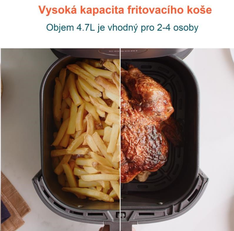 Teplovzdušnou fritézou COSORI CAF-L501-KEUE si môžete užiť vaše obľúbené vyprážané jedlá bez výčitiek, pretože na rozdiel od bežného vyprážania alebo fritovania je v tejto fritéze možné pripravovať jedlá za použitia veľmi malého množstva oleja alebo vôbec žiadneho. Kombinácia cirkulujúceho horúceho vzduchu, dokonalej teploty varenia a chytrých programov zaistí, že hranolky budú vždy krásne chrumkavé a kuracie stehná šťavnaté. Či už je vaše jedlo čerstvé alebo mrazené, stlačením tlačidla môžete horúcim vzduchom smažiť kuracie krídla, kuracie prsia, sladké zemiaky, steaky, čerstvé hranolky a mnoho ďalšieho. Až budete mať hotovo, čistenie bude veľmi jednoduché vďaka nepriľnavému košu, ktorý je možné umývať v umývačke. Vďaka nádobe s objemom 4,7 l navyše dokážete rýchlo navariť aj väčšie porcie jedla.