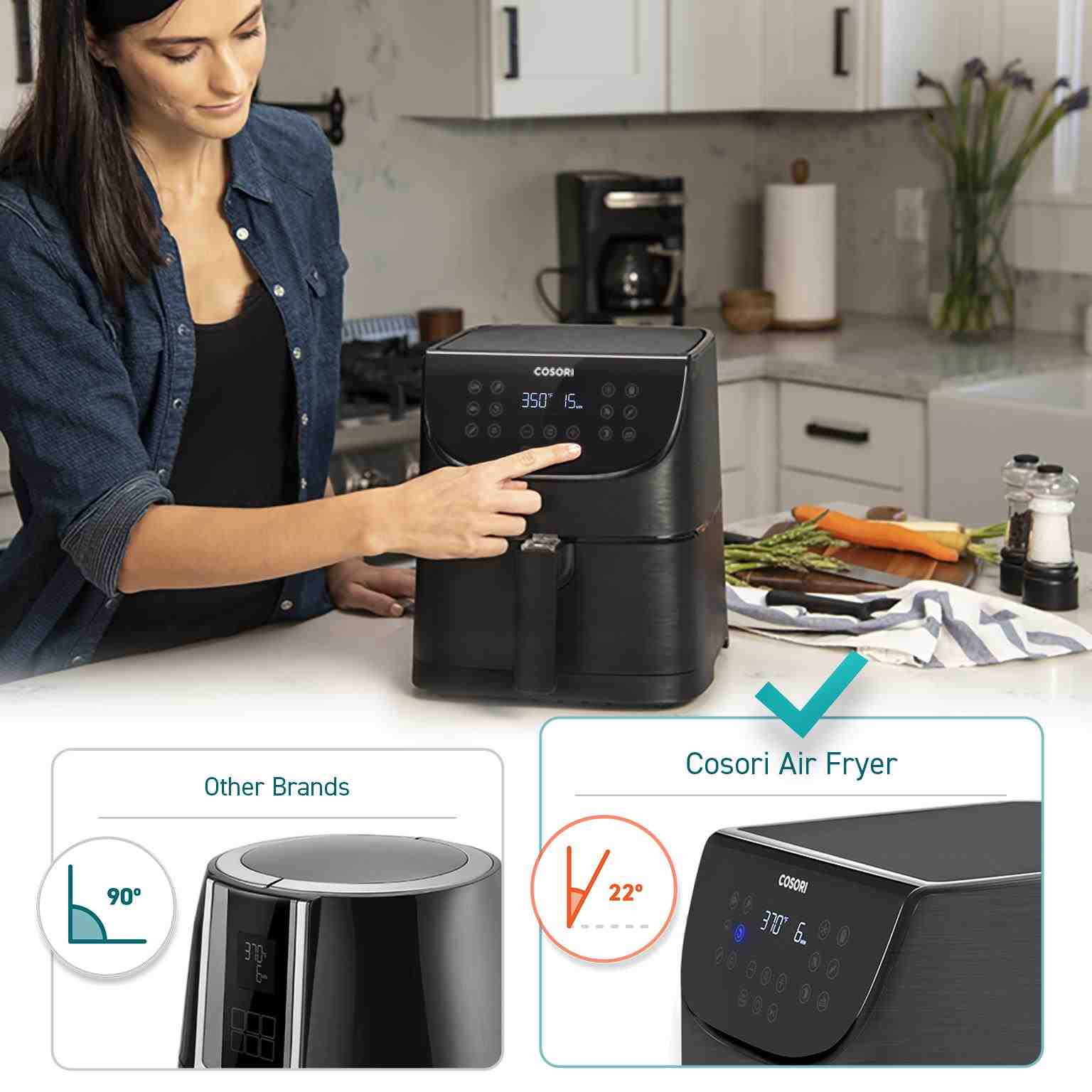 Dizajn teplovzdušnej fritézy COSORI CP158-AF bol navrhnutý v Kalifornii. Vďaka svojej praktickosti, funkciám, ovládaniu aj prehľadnému dotykovému naklonenému LED displeju sa ľahko prístupnými tlačidlami získal aj prestížne ocenenie Red Dot Award za najlepší dizajn.