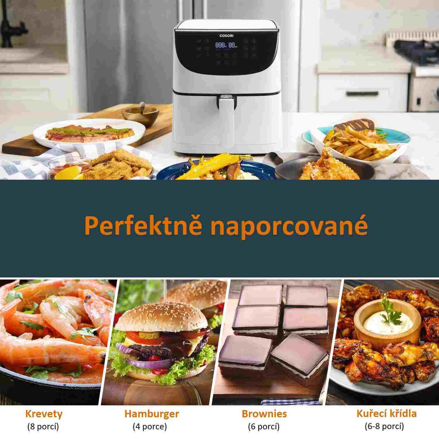 S teplovzdušnou fritézou COSORI CP158-AF PREMIUM si môžete užiť vaše obľúbené vyprážané jedlá bez výčitiek, pretože na rozdiel od bežného vyprážania alebo fritovania je možné v nej pripravovať jedlá za použitia veľmi malého množstva oleja alebo vôbec žiadneho. Kombinácia cirkulujúceho horúceho vzduchu, dokonalej teploty varenia a chytrých programov zaistí, že hranolky budú vždy krásne chrumkavé a kuracie stehná šťavnaté. Či už je vaše jedlo čerstvé alebo mrazené, stlačením tlačidla môžete horúcim vzduchom smažiť kuracie krídla, kuracie prsia, sladké zemiaky, steaky, čerstvé hranolky a mnoho ďalšieho. Až budete mať hotovo, čistenie bude rovnako jednoduché vďaka nepriľnavému košu, ktorý je možné umývať v umývačke. Vďaka veľkej nádobe s objemom 5,5 l navyše dokážete rýchlo navariť aj pre väčšiu rodinu alebo skupinu hostí.