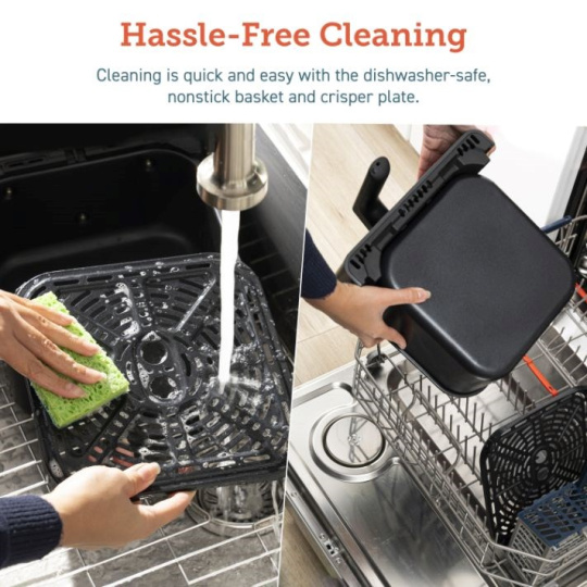 Vyjímateľný fritovací koš a nádoba sú vyrobené z odolného, nepriľnavého a zdravotne nezávadného materiálu (BPA a BFOA FREE) a je možné ich umývať v umývačke riadu. Vždy vychladená rukoväť a tlačidlo na uvoľnenie koša eliminujú riziko popálenia a nechceného uvoľnenia.