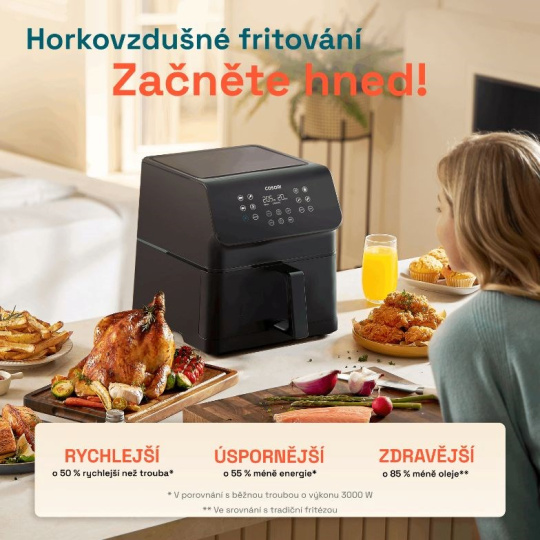 Teplovzdušná fritéza je moderný nástroj pre modernú dobu. Ľahko nahradí bežnú rúru s výrazne nižšou spotrebou energie, ponúka zdravšiu prípravu obľúbených pokrmov s minimálnym množstvom oleja a v neposlednom rade veľmi tichú prevádzku pre nerušenú domácnosť. Vďaka veľkej kapacite fritovacieho koša nie je problém variť pre štvorčlennú rodinu alebo pripraviť dokonalé pohostenie na večierok s priateľmi.