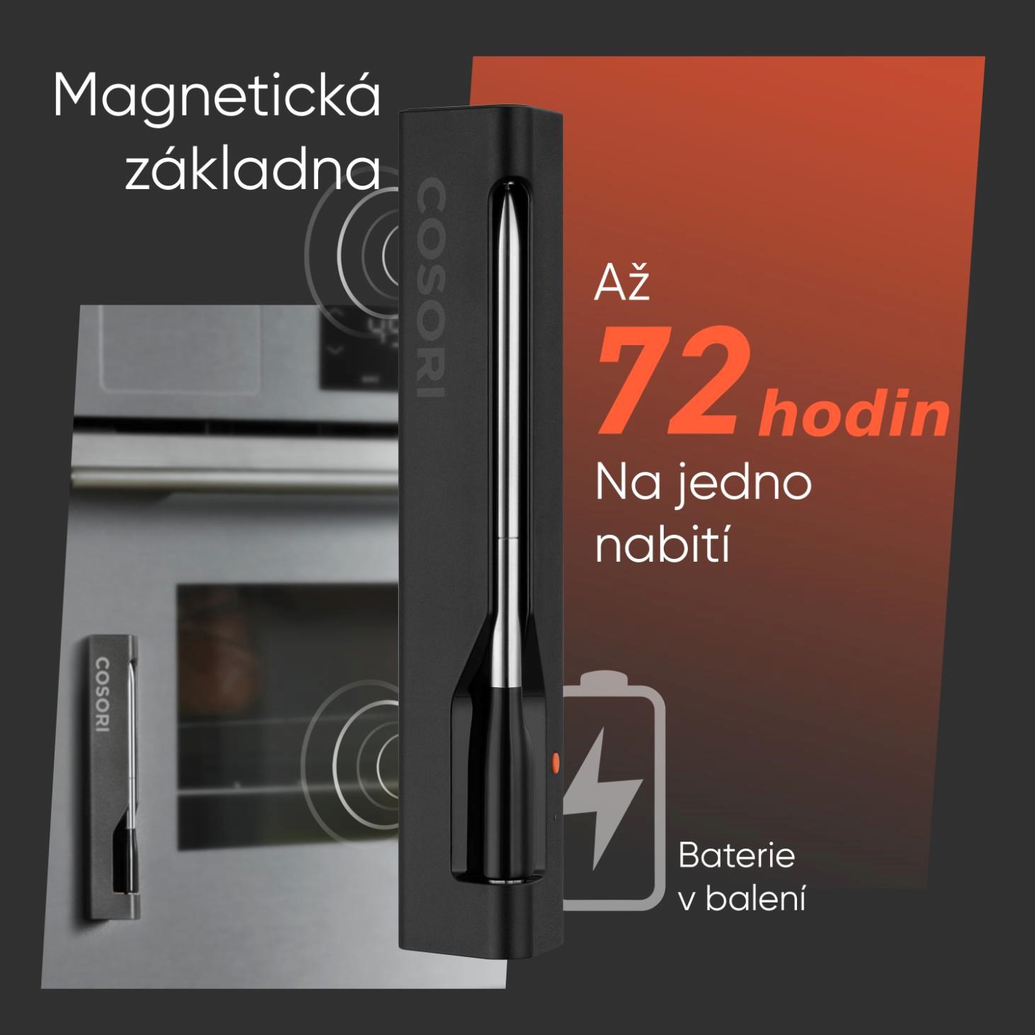 Teplomer COSORI získal prestížnu cenu iF Design Award 2023, ktorá vyzdvihuje jeho dokonalý vzhľad a robustnú konštrukciu. Sonda je vyrobená z nehrdzavejúcej ocele a keramiky, čo zaručuje bezpečné a zdravé používanie. Batéria sondy vydrží na jedno nabitie až 72 hodín, čo zaručuje nepretržité monitorovanie aj počas najdlhších príprav. Nabíjacie puzdro má tiež integrovaný magnet, takže ho môžete ľahko pripevniť na chladničku alebo iný kovový povrch pre pohodlné skladovanie. Sonda je vodotesná s certifikáciou IP67, takže ju môžete ľahko umývať ručne alebo v umývačke riadu. Vnútorný teplotný senzor meria mäso v rozmedzí od 0 °C do 100 °C s presnosťou ±1 °C, zatiaľ čo senzor okolitej teploty zvládne rozsah až do 300 °C.
