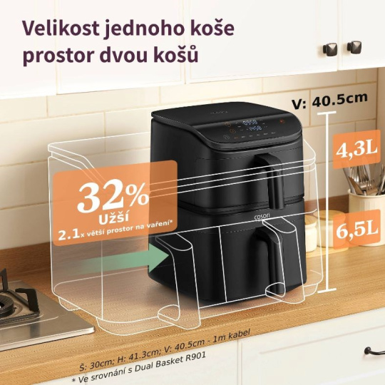 Turbo Tower Pro ponúka riešenie problému s priestorom. Fritéza zaberá minimum miesta, ale ponúka celkový objem takmer 11 litrov. Môžete tak naraz pripraviť obed pre celú rodinu, hromadu hranolčekov na filmový maratón alebo špeciality na večierok. Malý priestor nevadí, Cosori to rieši rozmermi 40,5 x 30 x 41,3 cm (v x š x h).